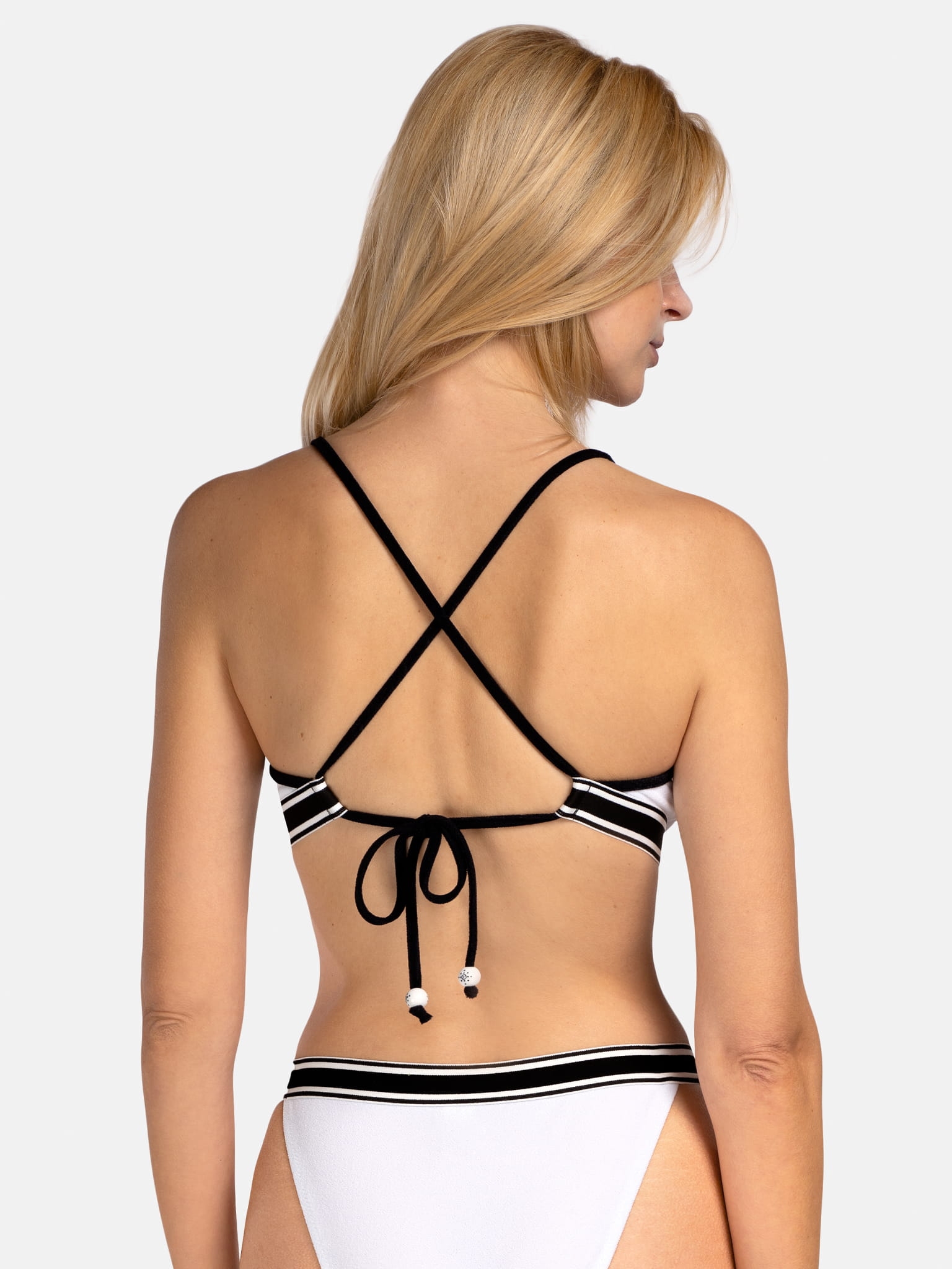Uniwersalna, bardzo wygodna góra bikini z kolekcji Miss Lou 2024 w kolorze ponadczasowej bieli z czarnymi dodatkami. Model wykonany z miłej w dotyku, elastycznej frotte. Ciekawe wiązanie oraz skrzyżowane na plecach, długie ramiączka zakończone ozdobnymi koralami, tworzą efektowny look, a kontrastująca guma pod biustem dodaje sportowego akcentu. Okrągłe, cienkie wkładki, można z łatwością usunąć, w zależności od indywidualnych potrzeb.