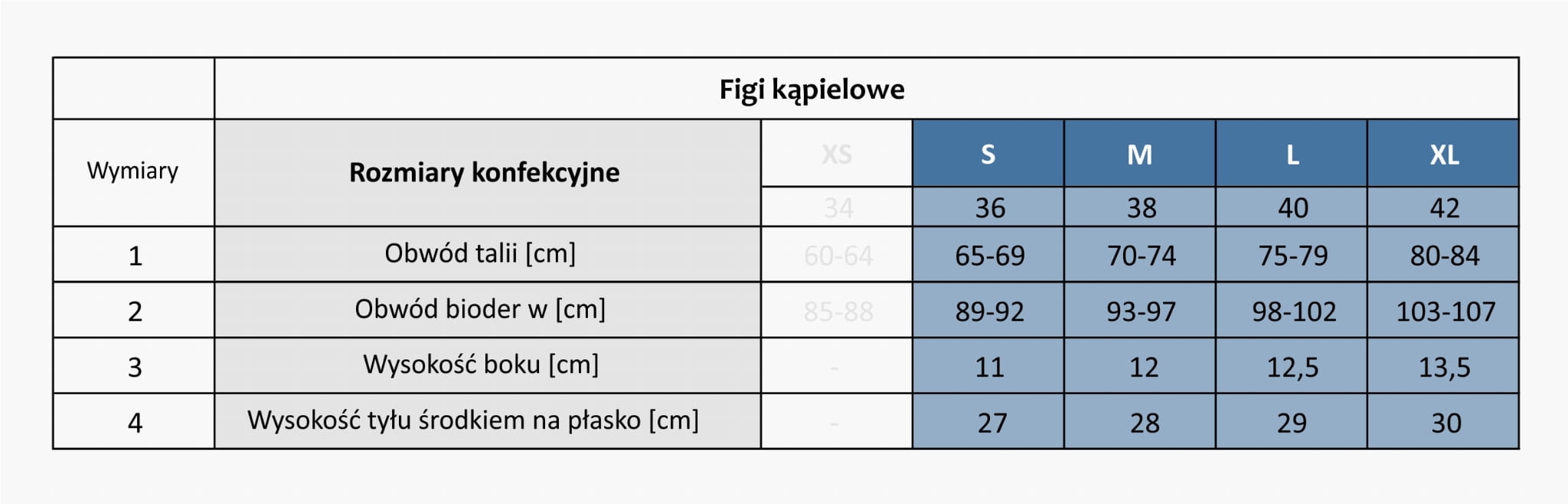 Figi te to produkt wyjątkowo uniwersalny. Sprawdzą się nie tylko na plaży, ale także na basenie. Niezależnie od tego, czy preferujesz kąpiele słoneczne, czy też szaleństwa w wodzie, solidnie wykonany produkt zapewni Ci wygodę i pełen komfort. Uniwersalność oraz elastyczność materiału sprawia, że doskonale dopasowują się do różnych sylwetek, zapewniając swobodę ruchów. Wysoki stan sięgający talii idealnie ją akcentuje a dwuwarstwowa metoda szycia ze szwami wewnętrznymi ma dodatkowe działanie wyszczuplające i maskujące brzuszek. Mocniejsze wycięcie na pośladkach doskonale podkreśla krągłość pupy a wyższe wycięcie na biodrach optycznie wydłuża nogi.